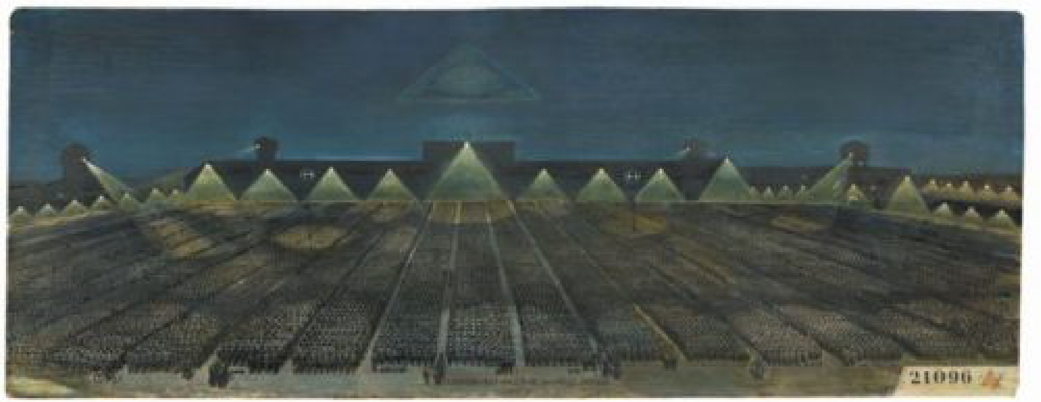 This particular artwork depicts inmates gathered in the vast yard of Dachau. The triangles of light symbolize the presence of God — a reminder that divine light can still exist even in the darkest places.